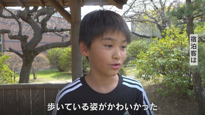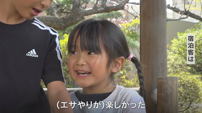 宿泊客は写真を撮ったりエサをあげたりして、その愛らしい姿に癒やされていました。