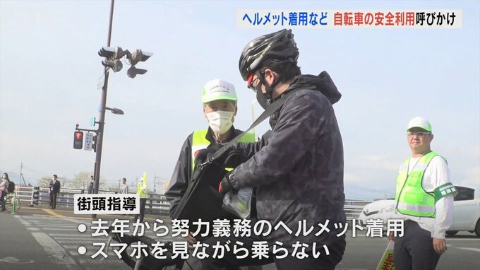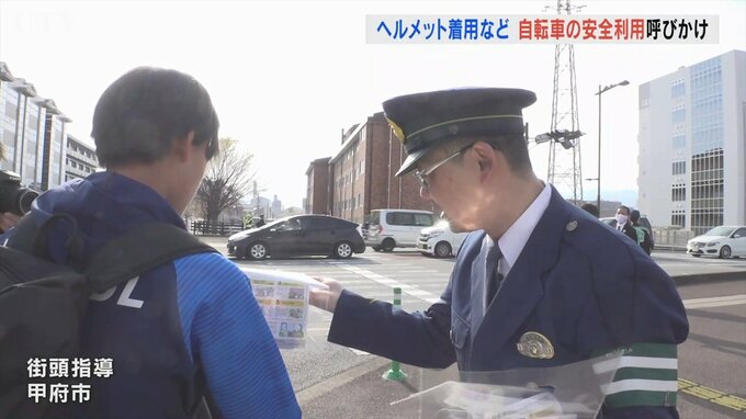 自転車に乗った学生や、甲府駅に向かう人が多く通る交差点で、甲府署員ら14人が、去年から努力義務となったヘルメットの着用や、スマホを見ながら乗らないことを呼びかけるチラシを配りました。