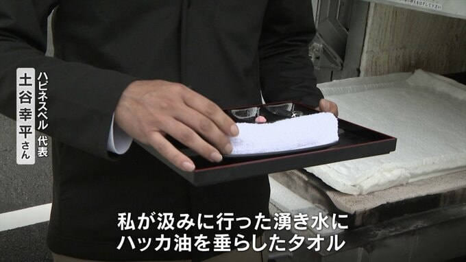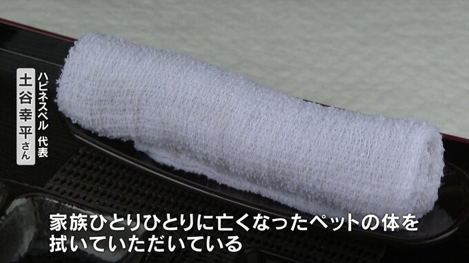 「私が汲みに行った湧き水にハッカ油を垂らしたタオル。家族ひとりひとりに亡くなったペットの体を拭いていただいている」