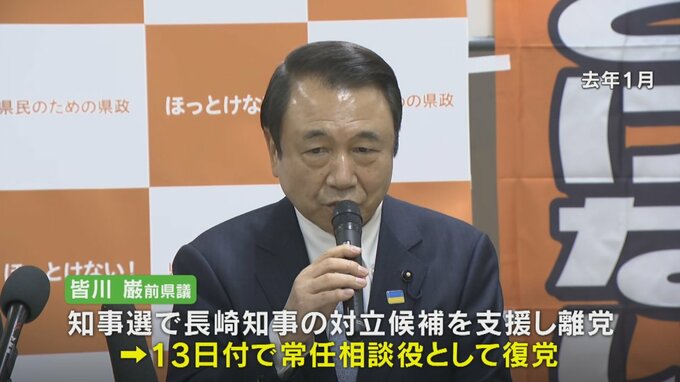 一方自民党県連は、去年の知事選挙で長崎知事の対立候補を支援したとして離党した皆川巌前県議を常任相談役として復党させると明らかにしました。