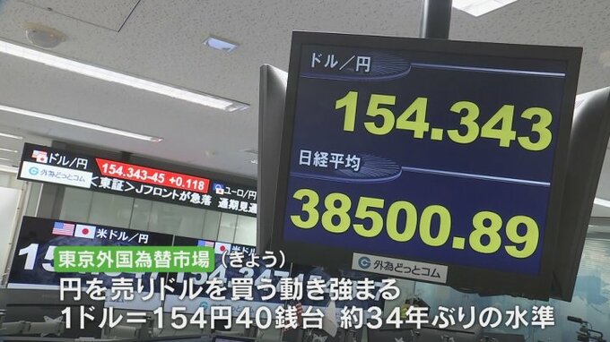 2023年4月16日の東京外国為替市場は円を売ってドルを買う動きが強まり1ドル=154円40銭台と約34年ぶりの円安水準となりました。