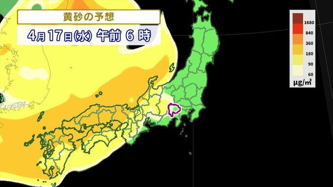 17日の天気のポイントは雨の後、黄砂に注意ということになります。