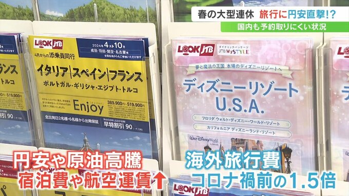 海外旅行を控えるのは、急激な円安と原油の高騰などで宿泊費や滞在費、航空機の運賃が上がり、海外の旅行代金はコロナ禍前のおおむね1.5倍に跳ね上がっているのが主な要因です。