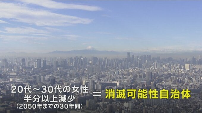 報告書では、若い女性の数が減ると人口が減り続けるとし、20代から30代の女性が2050年までの30年間に半分以上減少する市町村を「消滅可能性自治体」としています。