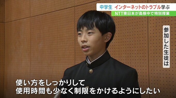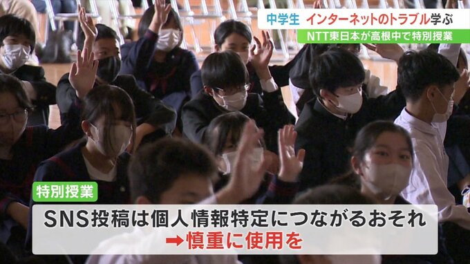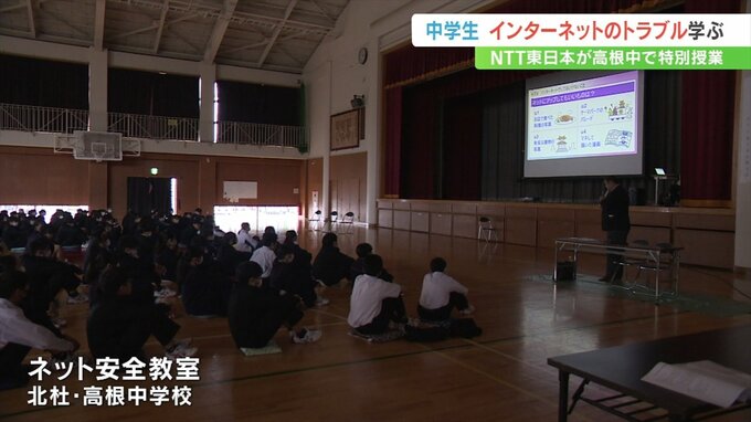 1日はNTT東日本の社員が北杜市の高根中学校で特別授業を行い、SNSへの投稿が個人情報の特定につながるおそれがあるため慎重に使用することが大切と説明しました。