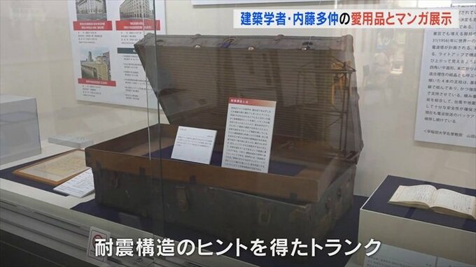 内藤がアメリカ留学の際に使った間仕切りのあるトランクは壊れにくく、耐震構造のヒントを得たという逸話はマンガにも描かれていますが、その実物も展示されています。