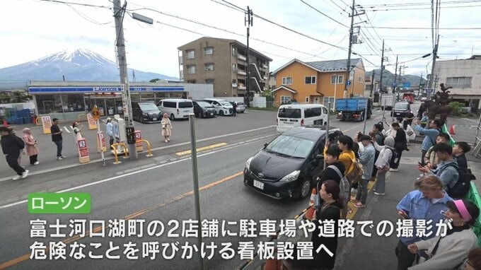 外国人観光客の迷惑行為が後を絶たない山梨県富士河口湖町の富士山の撮影スポットに、コンビニチェーンのローソンは道路の横断禁止を呼びかける看板を設置しました。
