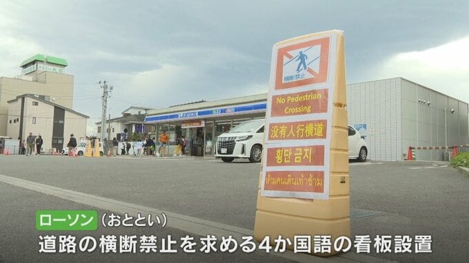 しかし、危険な道路の横断が後を絶たず、町は富士山を隠す黒い幕を今月中旬以降に設置する方針で、ローソンもおととい、道路の横断禁止を求める4か国語の看板を設置しました。