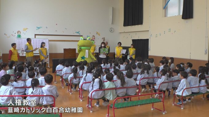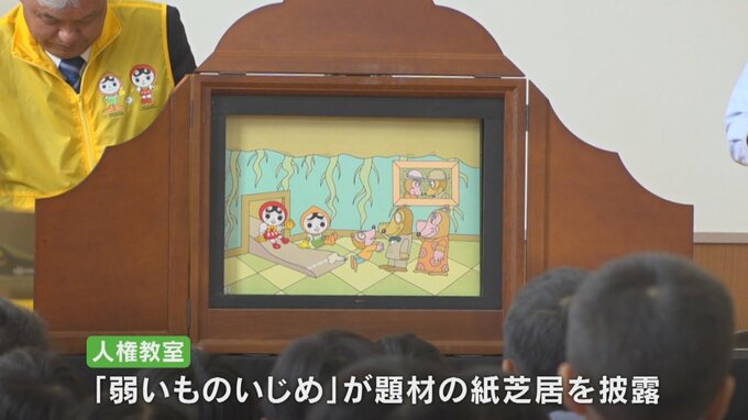 「弱いものいじめ」を題材にした紙芝居で、幼稚園児が人権について学びました。