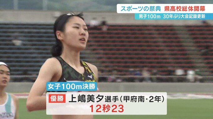 女子100mは甲府南高校2年の上嶋美夕選手が、大会3連覇がかかっていた山梨学院の奥村陽選手を破り、新女王に輝きました。