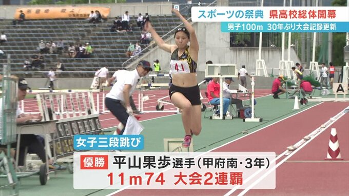 また、女子三段跳びは大会新記録まで6cmに迫る大ジャンプを見せた甲府南高校3年の平山果歩選手が大会2連覇を果たしました。