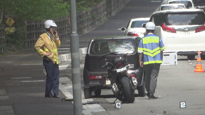 転倒でオートバイを運転していた男性が対向車線に投げ出され、向かって来た軽乗用車の側面にぶつかりました。