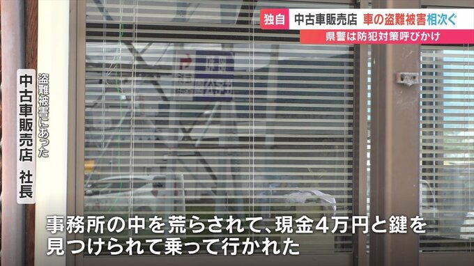 「鍵を見つけられ乗っていかれた」社長のプリウスも被害 中古車販売店で盗難相次ぐ 2024年5月9日(木) 20:05 国内 中古車販売店 社長: 「前の車を押されてスペースを作って、ここから出された」 中古車販売店 社長: 「プリウスの鍵はかかっていたんだけど事務所の中に隠してあった。事務所の中を荒らされて、現金4万円と鍵を見つけられて乗っていかれた」