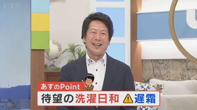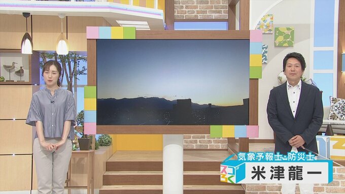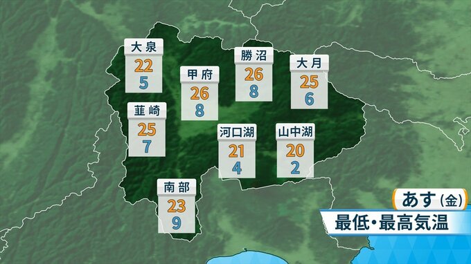 山中湖村では最低気温が2℃、河口湖も4℃ということで、甲府はけさよりもさらに低い8℃までしか上がりません。ですから、この気温で大体4月の中旬並みということで、昭和町、中央市を除きまして、霜注意報が県内全域に発表されていますので、農家の皆さん遅霜にはくれぐれも要注意です。そこから今度は日差しの力と暖かい空気の影響で気温が上がりましてきょうと比べて5℃ほど高くなるんです。ですから、気温差が20℃近くありますので、寒暖差で体調を崩されないようお気をつけください。