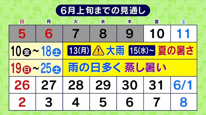 26日から6月の8日まで見ていくと天気コロコロ変わりやすくなりまして、ただ、晴れれば真夏日の日もあると予想しています。しばらく気温が高い状況が続きそうです。