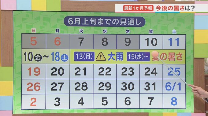 今後の天気を1か月予想で見ていきます。13日の月曜日は大雨に要注意で、15日の水曜日からまた夏の暑さで30℃近くまで上がるところも出てきそう。