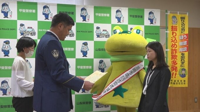 警察は詐欺の被害を未然に防いだとしいて、16日、山梨中央銀行韮崎支店と雨宮さんに感謝状を贈りました。