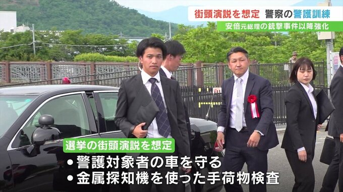 今回は選挙の街頭演説を想定して行われ、警護対象者が乗る車を走行中に守る訓練や、演説を聞きに来た人が危険物を持ち込まないよう、金属探知機を使っての手荷物検査などを行いました。
