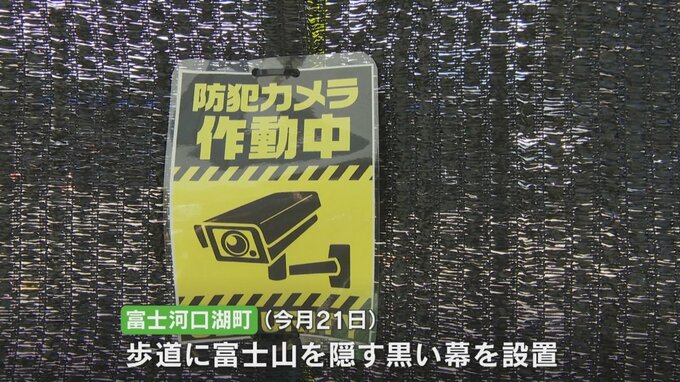 富士山を撮影するため危険な道路横断など外国人観光客の迷惑行為が相次いでいた河口湖駅近くのローソンの歩道には今月21日、富士河口湖町が富士山を隠す黒い幕を設置しました。