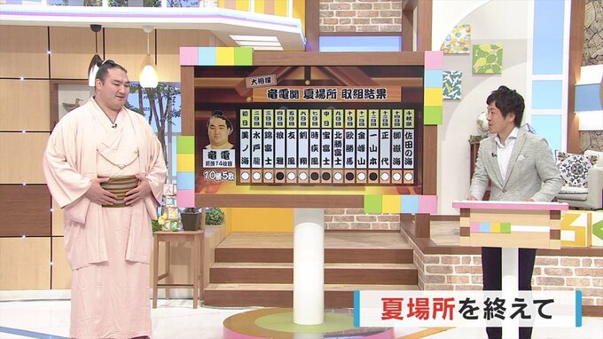 竜電関:先場所は前に出る相撲が少なく、受ける相撲ばかりだったんです。でも今場所は勝ってる相撲は全部前に出てる相撲なんで、そこら辺の違いが10勝5敗だったのかなと思います。逆転の投げだったりがあったんで、やっぱり粘りしぶとさが自分の真骨頂だと思ってるので。