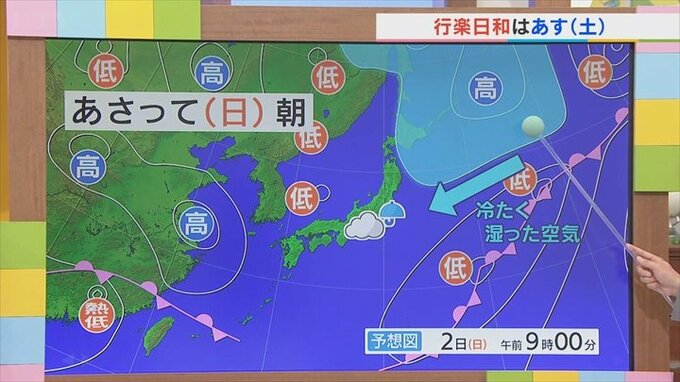 あさって日曜日は曇りや雨の影響できょうと同じようなパターンであまり気温が上がらないことになりそうです。