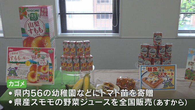今年はカゴメが県内56の幼稚園や小学校にトマトの苗を贈るほか、県産のスモモを使った野菜ジュースを4日から全国で約900万本販売します。