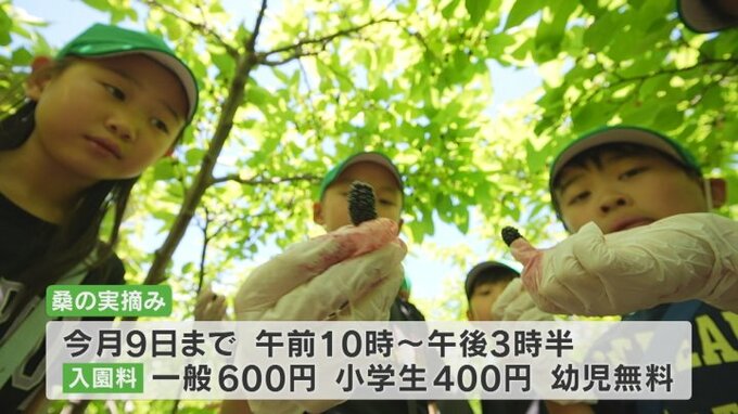 子どもにとっては「新鮮な」甘酸っぱさが楽しめる桑の実の摘み取り体験は今月9日まで開催されています。