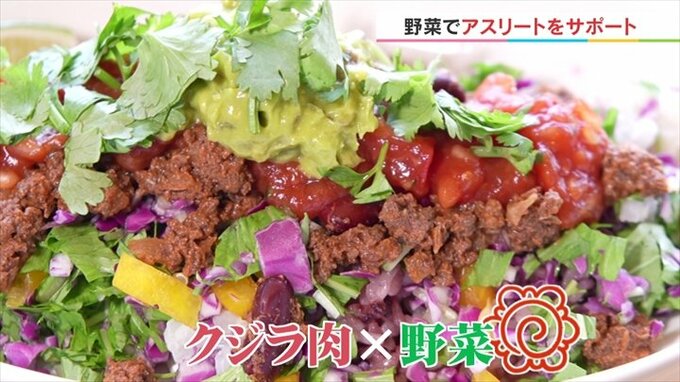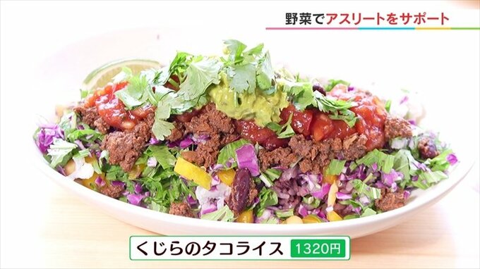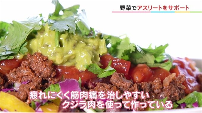 「茶色のタコミートの部分はクジラのお肉を使っています。低脂質で高たんぱく、疲れにくく筋肉痛を治しやすい効果のあるクジラ肉を入れて作ってます。」