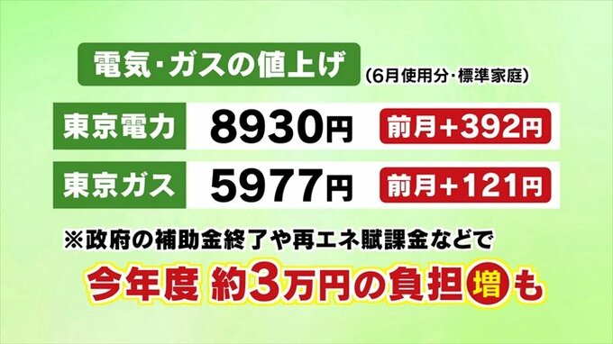 まずは改めてどれくらいの値上げになるかというと、今月使用分の電気代は東京電力管内では標準家庭で前の月と比べて392円値上がりした8930円と過去最高水準に近い状態。