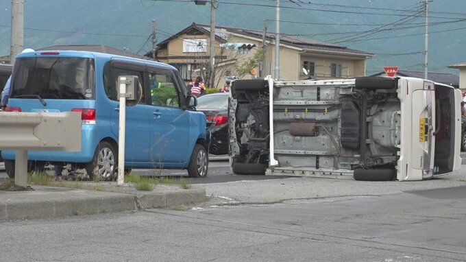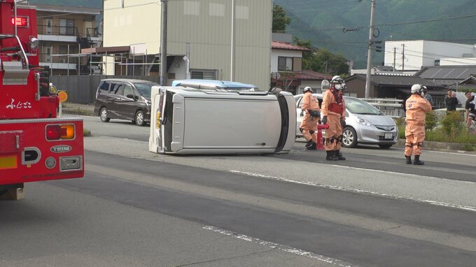 消防によりますと、横転した車を運転していた50代男性と、ほかの軽乗用車を運転していた60代男性が病院に運ばれました。