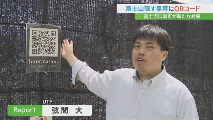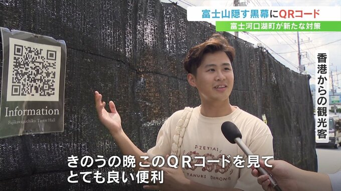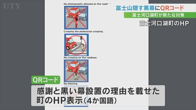 観光客のマナー違反が相次いだため山梨県富士河口湖町のコンビニの前に設置された黒幕に、町は観光情報などを知らせるQRコードを張りつけました。