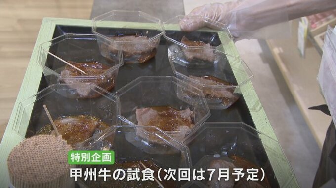 12日はオープンを記念して甲州牛の試食が行われ、県産和牛の品質をアピールしていました。