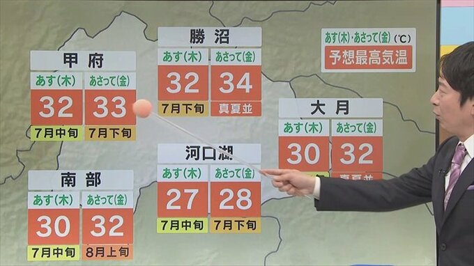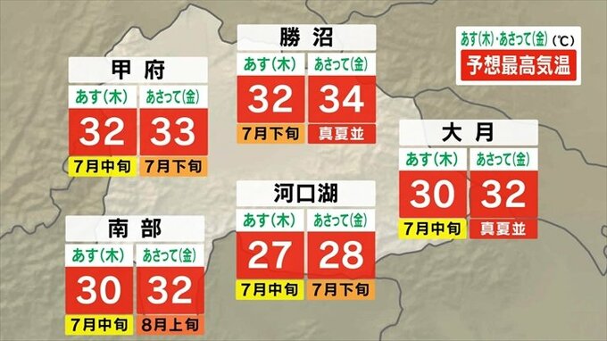あすはきょうよりも2℃ほど低いところはありますが、それでも7月の中旬から下旬並みで、あさってもまた今日と同じくらい暑くなります。