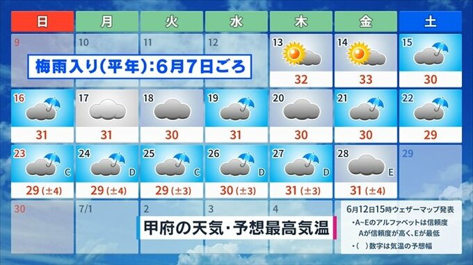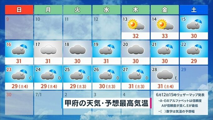 今後はどうなるか、甲府の16日間先の予報を見ます。