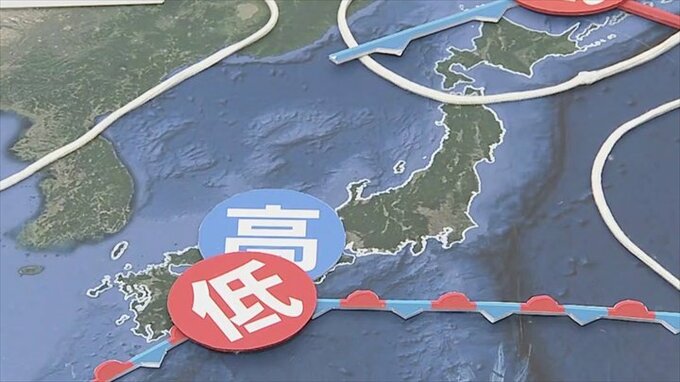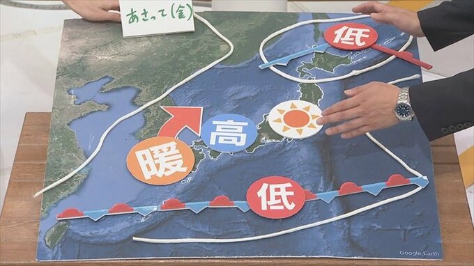 きょう晴れた要因は、この高気圧から低気圧に向かって暖かい空気が流れ込んできたことです。