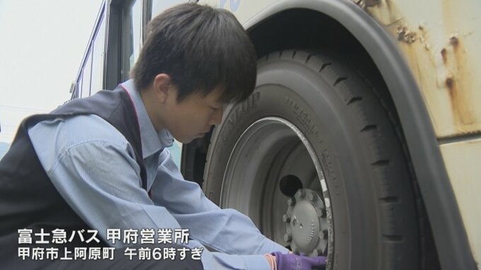 緊張した面持ちでタイヤの空気圧などを確認しているのは、2024年2月に入社した富士急バスの内藤優斗さん19歳。