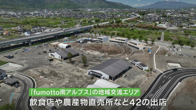 「fumotto南アルプス」の地域交流エリアには飲食店や農産物直売所など42の出店が予定されています。