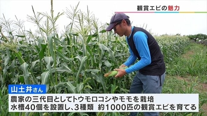 現在は農家の三代目として、トウモロコシやモモを栽培しつつ、水槽を40個設置し、3種類 なんと約1000匹の観賞エビを育てています。