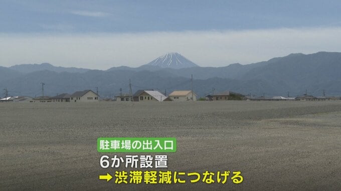 駐車場の6か所に出入り口を設け、渋滞の軽減につなげます。