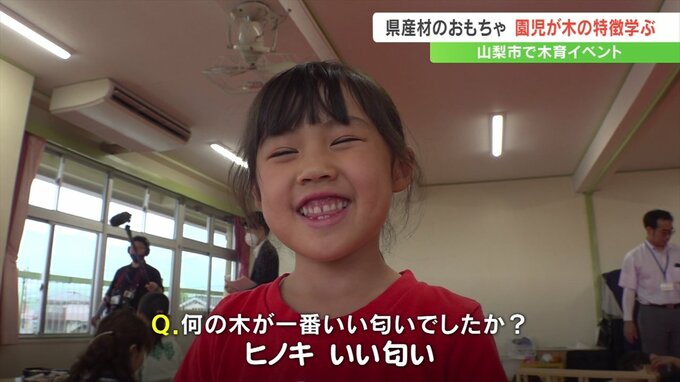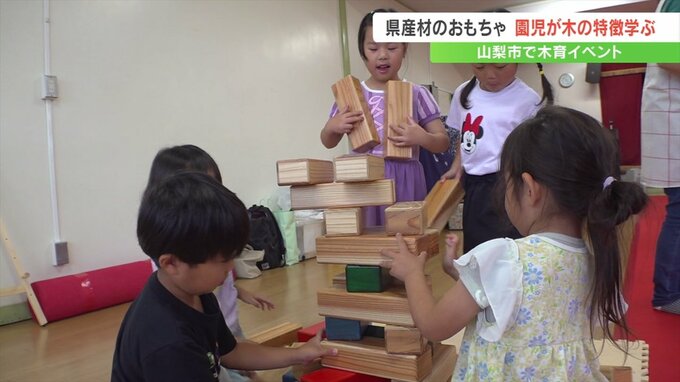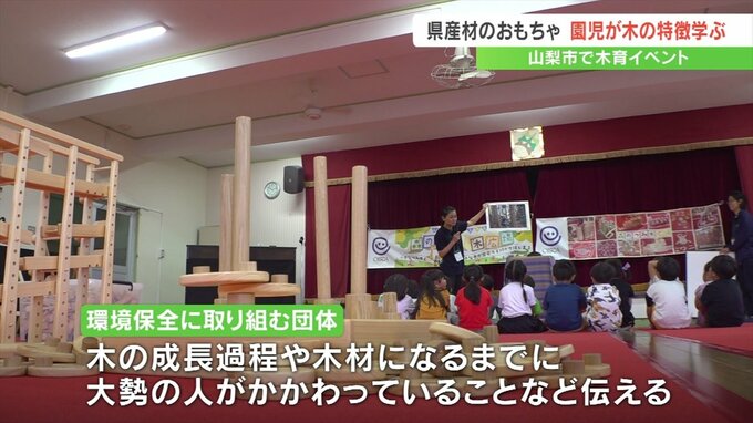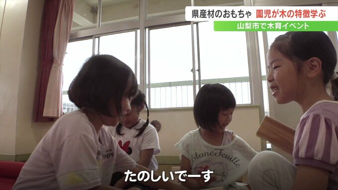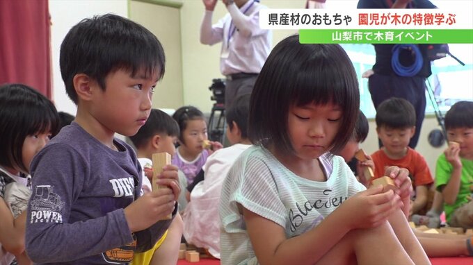 山梨県産の木で作ったおもちゃで遊ぶイベントが山梨市の保育園で行われ、園児が木の特徴などを学びました。
