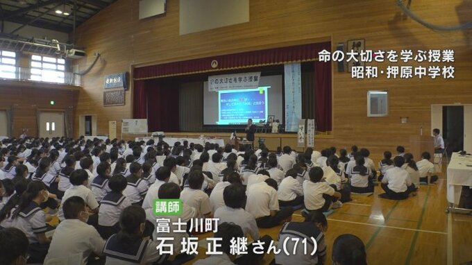 昭和町の押原中学校の生徒や保護者およそ800人の前で講演したのは富士川町の石坂正継さんです。