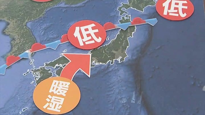 今度はこの前線に向かって暖かく湿った空気=雨雲のもとを運んでくる形となります。