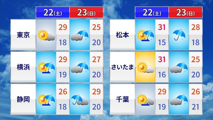 日曜日は静岡と松本でまとまった雨となりますので、ちょっと雨の降り方も強くなるかもしれません。