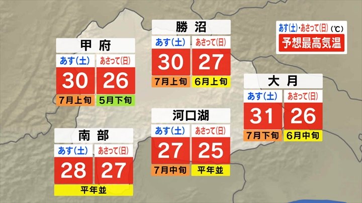 ですから、平年並みさらに平年よりも低いところもあるということで、あす土曜日は特に熱中症への注意が必要です。