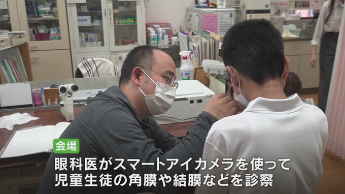 会場では眼科の医師がスマートアイカメラを使って児童や生徒の角膜や結膜などの様子を診察し、傷や炎症がないかを確認していました。