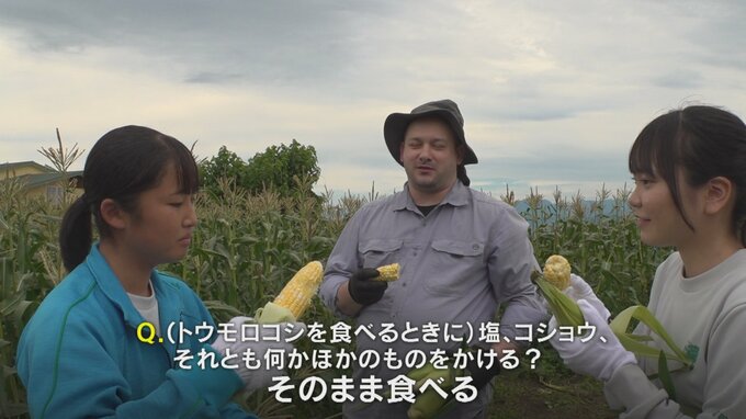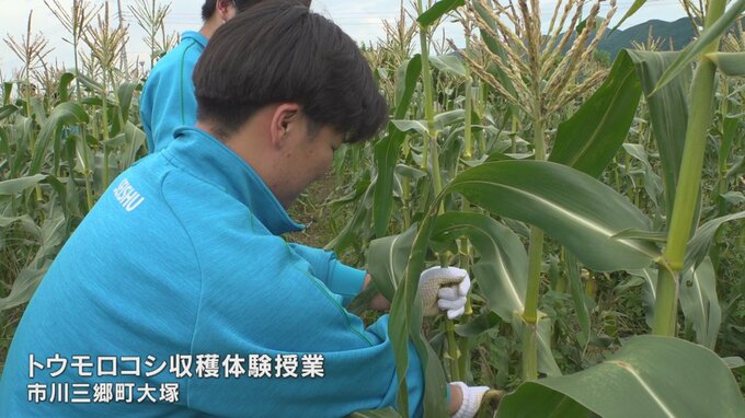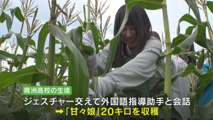 山梨県立青洲高校の生徒が、英語で会話しながら地元特産のトウモロコシを収穫する授業を体験しました。