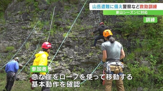 訓練は北杜市大泉町の山の中で行われ、参加者は急な崖をロープを使って移動する基本の動きを確認しました。