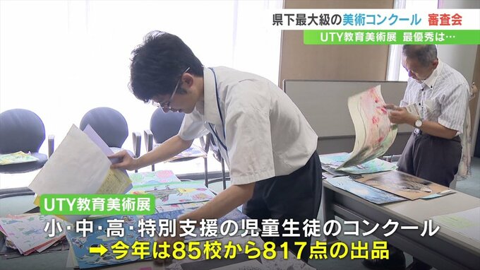 UTY教育美術展は県内の小・中・高校・特別支援学校の児童生徒の美術コンクールで、今年は85校から817点の出品がありました。