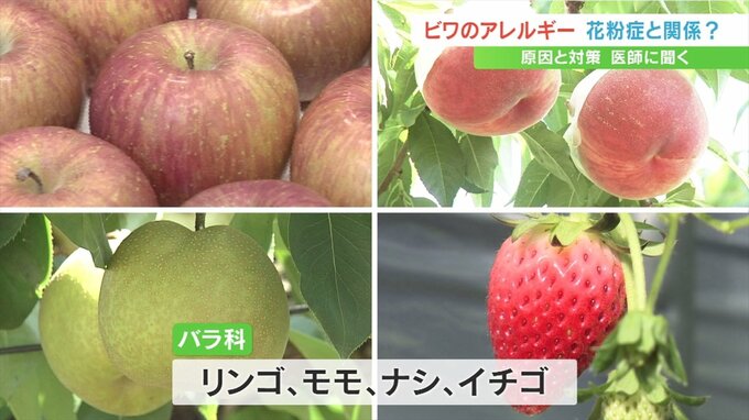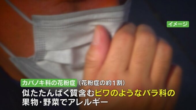 約3割の人が発症しているとされる花粉症のうち、1割ほどとみられるハンノキなどカバノキ科の花粉症がある人は、似たタンパク質を含むビワのようなバラ科の果物や野菜を食べたときにアレルギーを引き起こすことがあります。