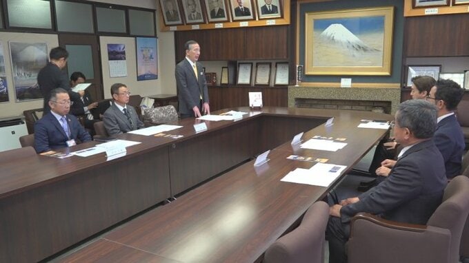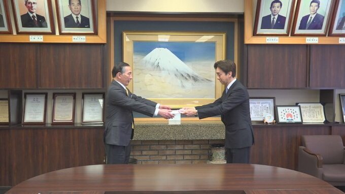 28日は富士急行の堀内光一郎社長が富士吉田市の堀内茂市長に寄付金を手渡しました。